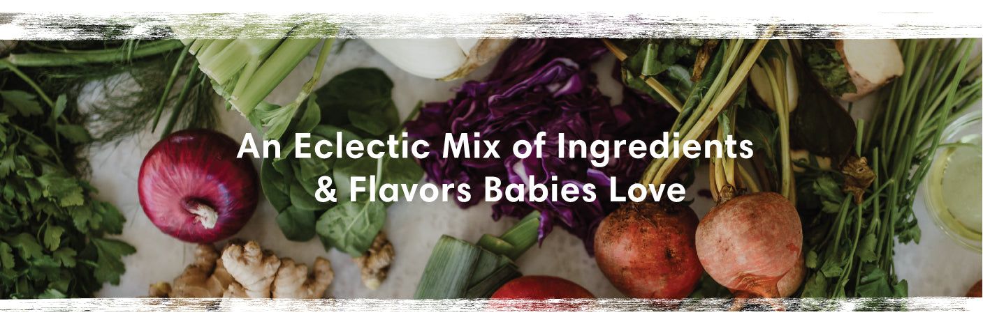 Made up of fresh, organic fruits, vegetables, spices, herbs, roots and legumes from around the world. Take your palate for trip around the globe with our worldly inspired ingredients thoughtfully selected for adventurous babies like yours.