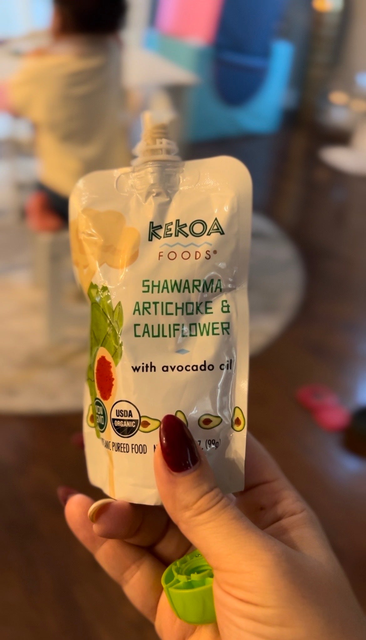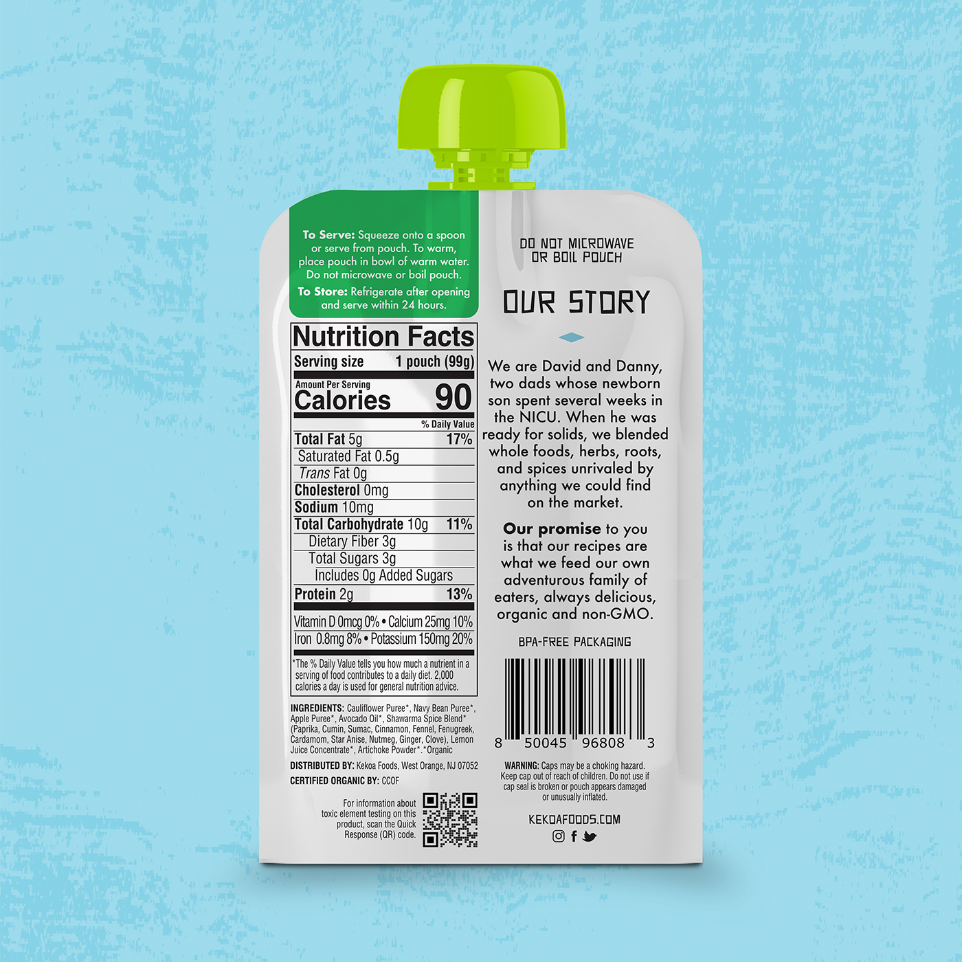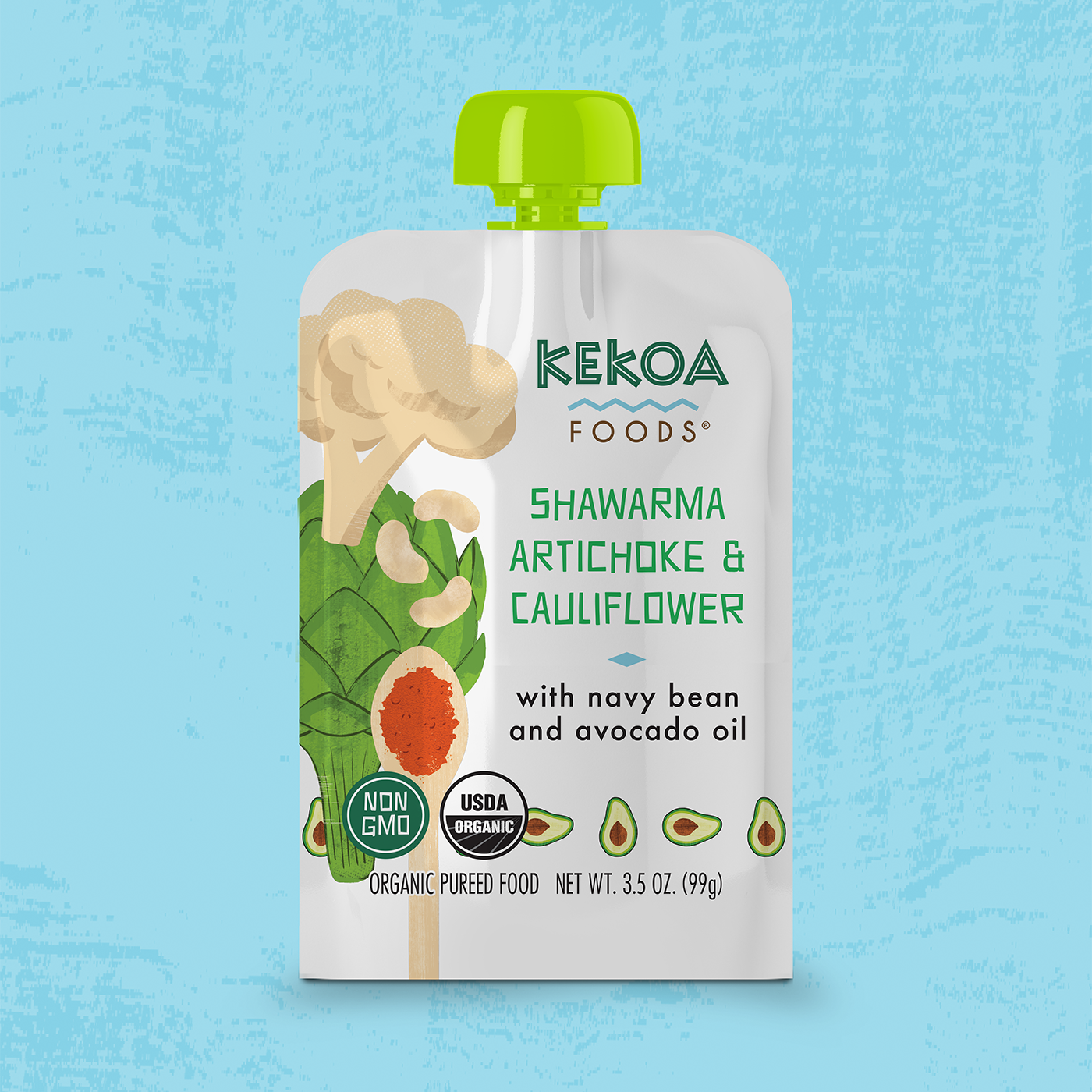 Adventurous babies will love the burst of flavor from warm Middle Eastern spices complimenting earthy vegetables in Kekoa Foods’ Shawarma, Artichoke & Cauliflower baby food pouch. Creamy navy beans add plant-powered protein and richness, while heart-healthy avocado oil brings smoothness and essential fatty acids. Cauliflower and artichokes create a nutrient-dense base, and a touch of apple adds just the right hint of natural sweetness. Finished with a globally inspired spice blend, this bold and balanced purée encourages little ones to explore a world of flavor.