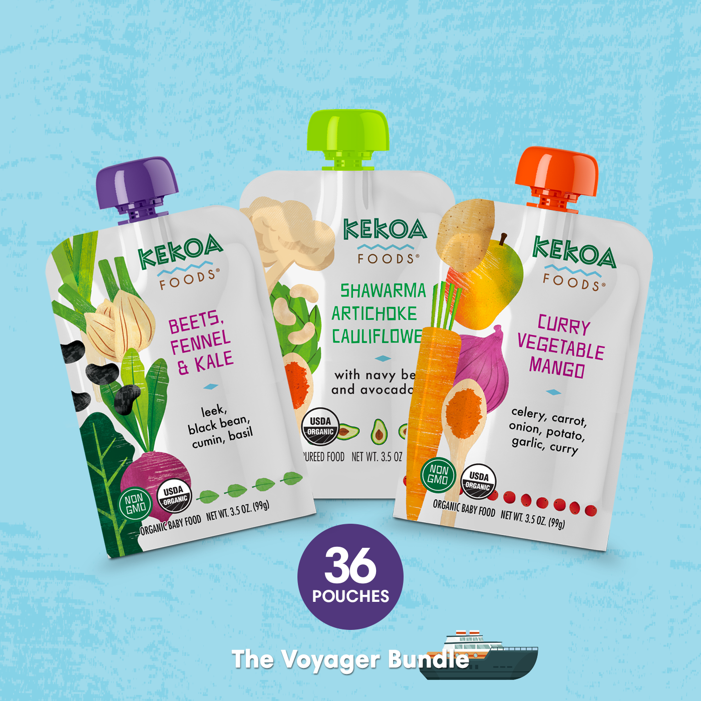 The Voyager Bundle includes 36 pouches in all: two 6-packs of Beets, Fennel & Kale, one 6-pack of Shawarma Artichoke & Cauliflower, and three 6-packs of Curry Vegetable Mango.